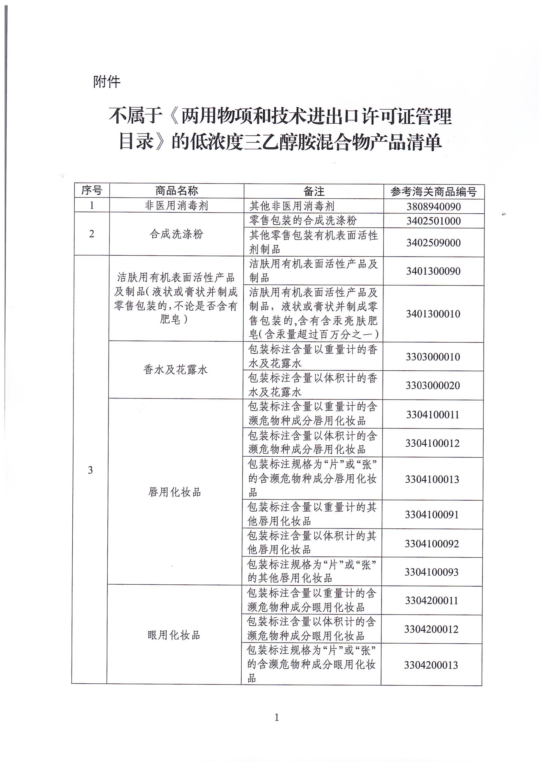 三乙醇胺含量較低的非醫(yī)用消毒劑、合成洗滌粉、化妝品、墨水等消費類商品(詳見附件),防擴散風(fēng)險可控,不屬于《兩用物項和技術(shù)進出口許可證管理目錄》中三乙醇胺(海關(guān)商品編號2922150000)和三乙醇胺混合物(海關(guān)商品編號3824999950)項下的管控物項,無需辦理監(jiān)控化學(xué)品進出口審批手續(xù),無需辦理兩用物項和技術(shù)進出口許可。