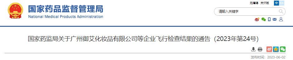 2023年6月1日,國家藥監(jiān)局發(fā)布關(guān)于廣州御艾化妝品有限公司等企業(yè)飛行檢查結(jié)果的通告(2023年第24號),具體內(nèi)容如下: