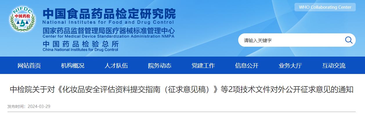 2024年3月29日,中檢院發(fā)布關(guān)于對《化妝品安全評估資料提交指南(征求意見稿)》對外公開征求意見的通知。
