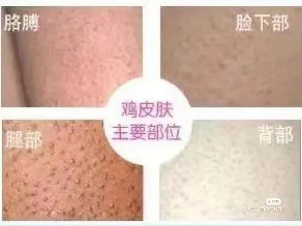 “雞皮”常分布于上臂及大腿外側(cè),也可發(fā)生于面部及臀部,摸著有粗糙感,外觀像雞皮疙瘩,一般無瘙癢,冬天較嚴(yán)重而夏天癥狀則減輕。