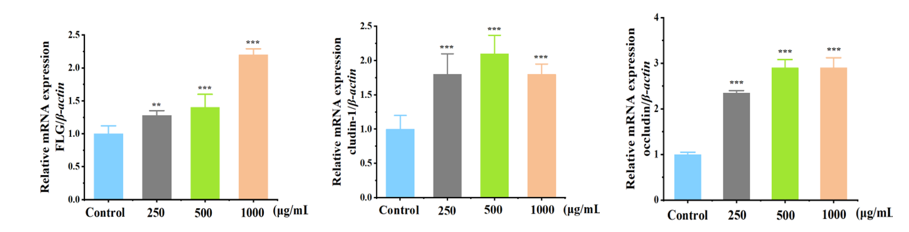如圖,與對(duì)照組相比,隨著樣品濃度的上升,屏障相關(guān)基因表達(dá)逐漸升高,表明樣品能夠有效促進(jìn)細(xì)胞保濕和修護(hù)。