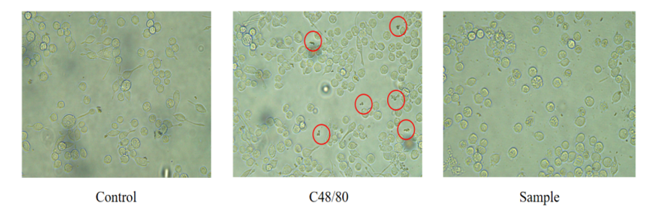 皮膚在外界環(huán)境刺激下,會(huì)激活肥大細(xì)胞進(jìn)而引起其活化、脫顆粒等情況。通過C48/80誘導(dǎo)肥大細(xì)胞活化脫顆粒,使用樣品后脫顆粒數(shù)量明顯減少,表明樣品具有良好的舒緩功效。