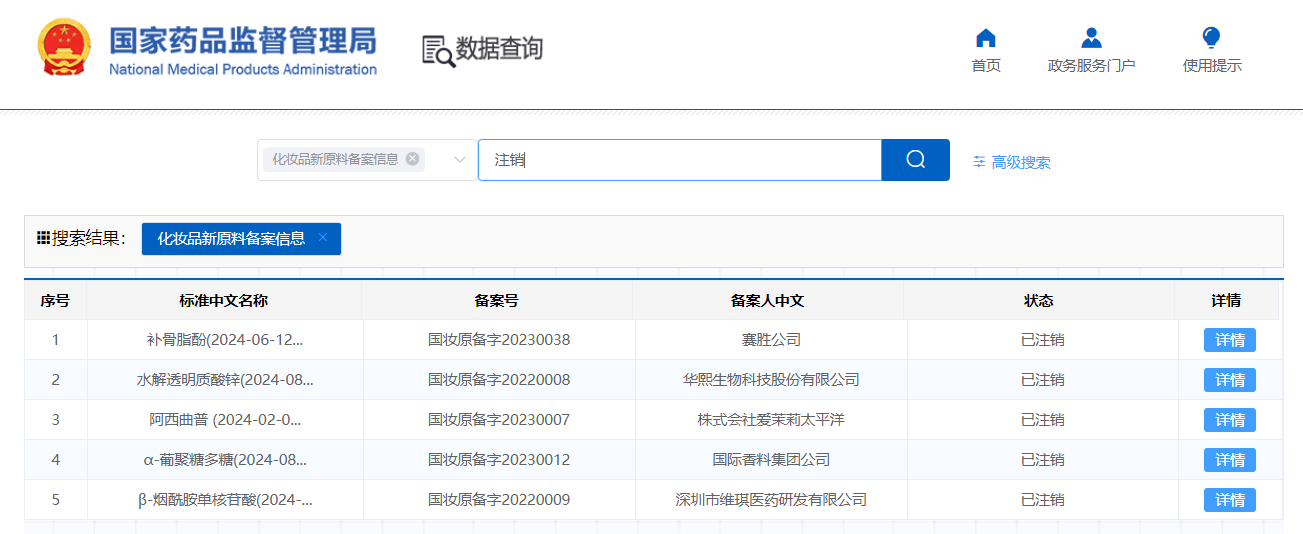 通過查詢國家藥品監(jiān)督管理局,目前已有五個新原料備案號于今年注銷。分別為:阿西曲普(國妝原備字20230007,注銷于2024年2月1日)、補(bǔ)骨脂酚(國妝原備字20230038,注銷于2024年6月12日)、水解透明質(zhì)酸鋅(國妝原備字20220008,注銷于2024年8月22日)、α-葡聚糖多糖(國妝原備字20230012,注銷于2024年8月22日)、β-煙酰胺單核苷酸(國妝原備字20220009,注銷于2024年9月13日)。