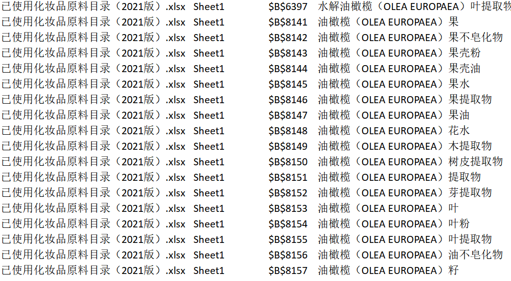圖1 《已使用化妝品原料目錄(2021年版)》中油橄欖相關(guān)原料