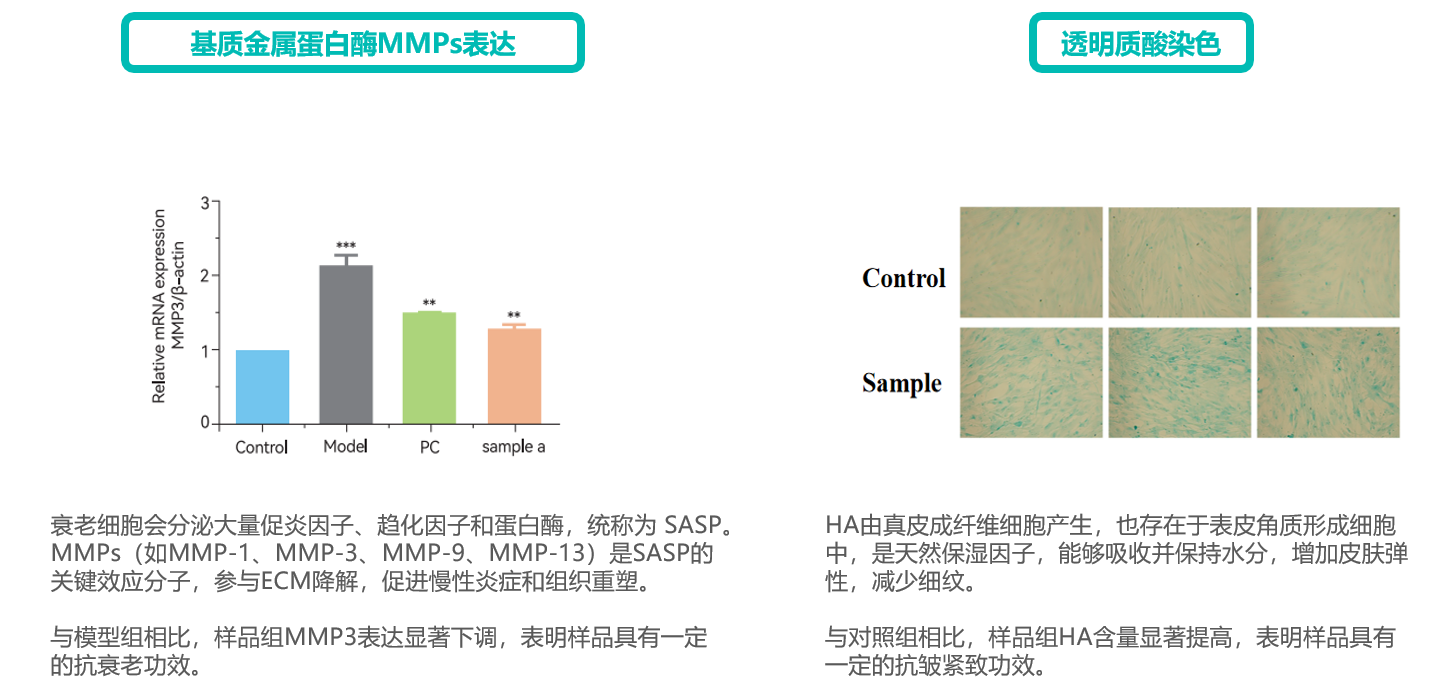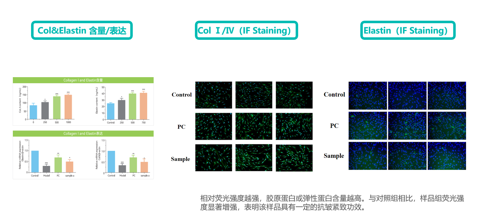 細(xì)胞分泌膠原蛋白增強(qiáng)皮膚彈性 | 膠原蛋白(ⅠⅢ Ⅳ等) | RT-qPCR | ||