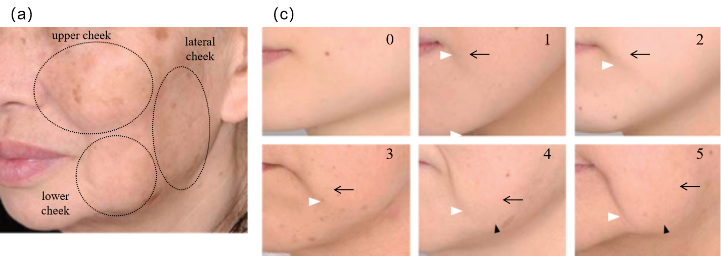 臉頰作為一個單一區(qū)域被評估,顯然是不合理的。臉頰的上、下和側部區(qū)域本身存在不同的下垂特征。這源于不同區(qū)域的組織結構存在差異,例如表情肌、咀嚼肌和皮下脂肪的分布差異,便形成了臉頰的自然分區(qū),因此在頰上部、頰下部、頰側部(三個容易嚴重下垂的區(qū)域,如圖1a-虛線區(qū))觀察下垂/松弛特征,并分別探討其與皮膚功能和結構變化之間的關系。