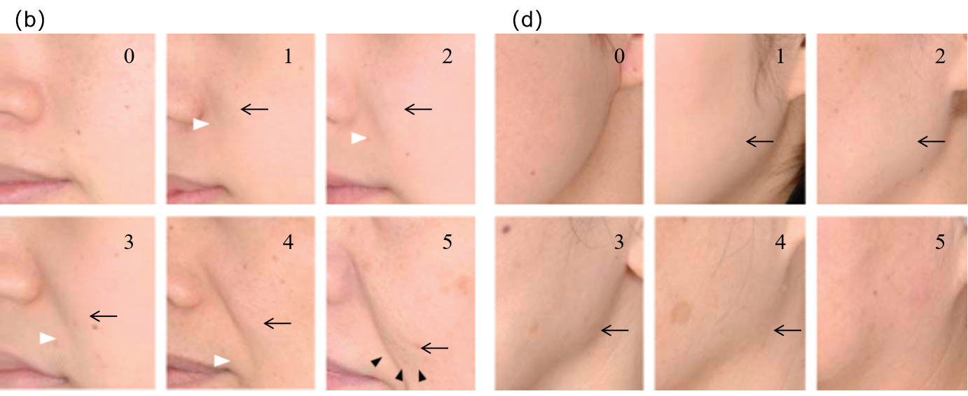 1級,輕微下垂:嘴角附近可見輕微凸起區(qū)域(黑色箭頭所示)??梢娸p微木偶紋(白色箭頭所示);