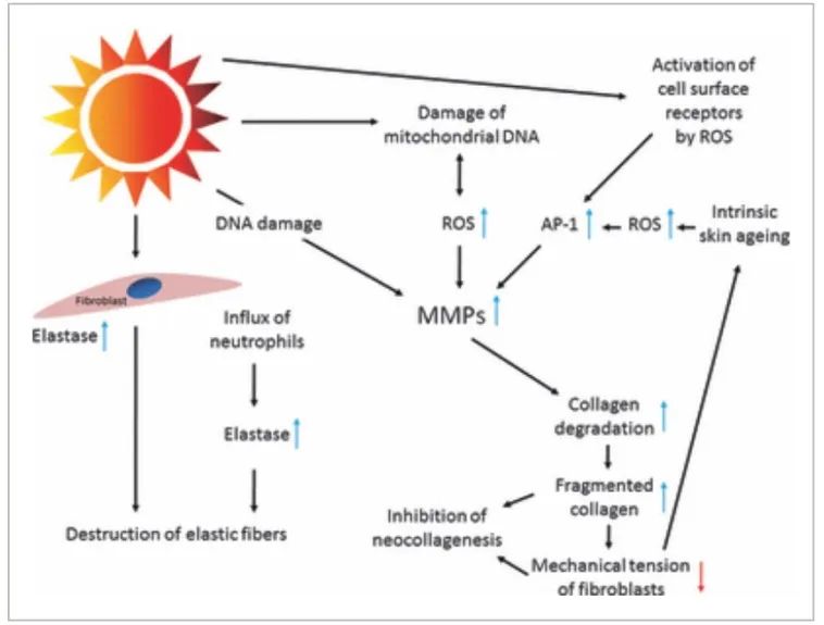 紫外線誘導(dǎo)的活性氧(ROS)和DNA損傷導(dǎo)致角質(zhì)形成細(xì)胞和成纖維細(xì)胞中基質(zhì)金屬蛋白酶的誘導(dǎo)增加。蛋白水解酶有助于ECM的降解。此外,紫外線照射直接刺激成纖維細(xì)胞中彈性蛋白酶的產(chǎn)生。導(dǎo)致部分降解的膠原蛋白和成纖維細(xì)胞的機(jī)械張力降低抑制了新膠原的發(fā)生。機(jī)械張力的降低導(dǎo)致ROS的進(jìn)一步產(chǎn)生,這再次導(dǎo)致基質(zhì)金屬蛋白酶的表達(dá)增加[4]。