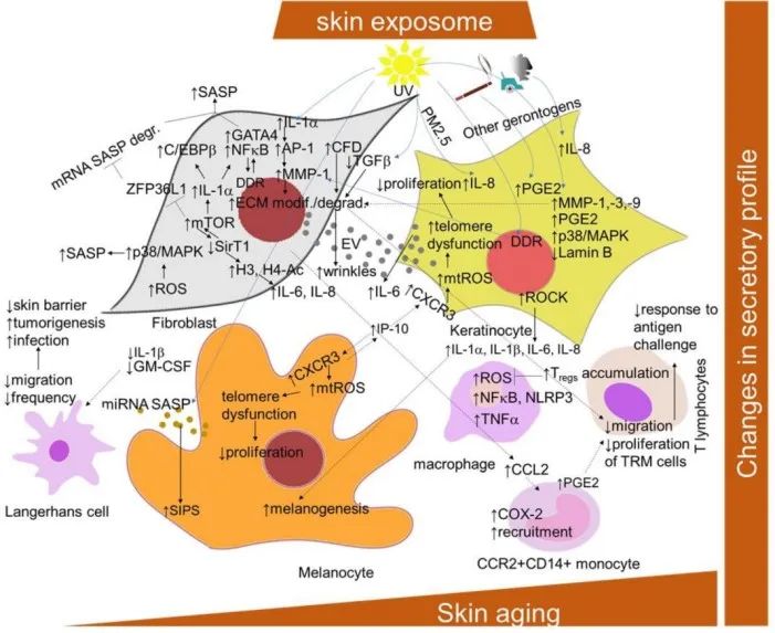 炎癥表現(xiàn)為血清炎癥細(xì)胞因子(如IL-6,IL-8和TNF-α)水平升高,不僅僅限于與年齡相關(guān)的全身性改變,還可能涉及皮膚老化。值得注意的是,衰老過(guò)程中積聚在皮膚中的衰老細(xì)胞在驅(qū)動(dòng)皮膚發(fā)炎方面起主要作用[5]。它們表現(xiàn)出改變的分泌組,稱為衰老相關(guān)分泌表型(SASP),其包括促炎細(xì)胞因子,趨化因子,蛋白酶和生長(zhǎng)因子,可顯著改變皮膚的微環(huán)境[6]。