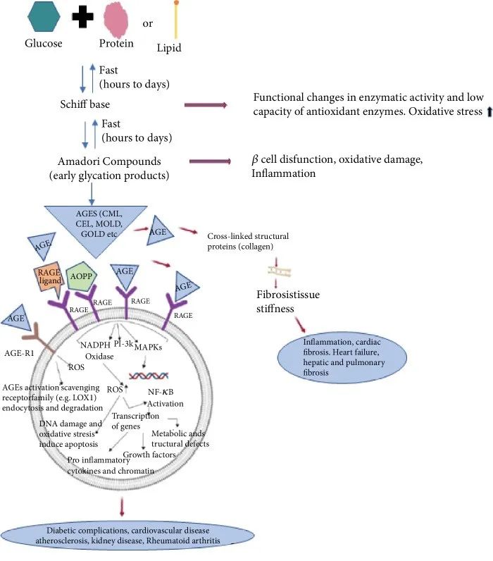 糖化反應(yīng),其實(shí)是非酶糖基化(Non-enzymatic glycation, NEG)反應(yīng)俗稱糖化反應(yīng),是指還原性糖(如葡萄糖)上的羰基與蛋白質(zhì)、脂質(zhì)或核酸等大分子上的游離氨基之間所發(fā)生的非酶性縮合反應(yīng)。糖(葡萄糖和果糖)和真皮中的膠原蛋白發(fā)生反應(yīng)后,會(huì)先形成初級(jí)糖基化產(chǎn)物(可逆),后面會(huì)繼續(xù)形成高級(jí)糖基化終末產(chǎn)物(AGEs,這是不可逆的物質(zhì))。膠原蛋白在糖化反應(yīng)下,結(jié)構(gòu)被破壞,彈性會(huì)降低,同時(shí)又會(huì)強(qiáng)烈吸收紫外線,在紫外線的作用下產(chǎn)生更多自由基,從而導(dǎo)致皮膚衰老更嚴(yán)重,成為一個(gè)惡性循環(huán)[7-8]。