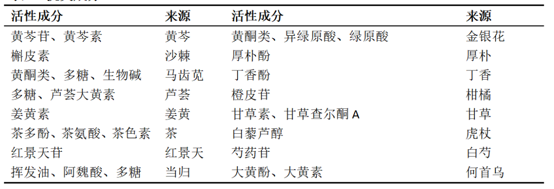 與傳統(tǒng)化妝品相比較,中藥來(lái)源的抗衰老成分是從植物中提取出來(lái)的天然物質(zhì),分子更細(xì)小,更容易被皮膚吸收和消化,而且不致在體內(nèi)產(chǎn)生沉積,目前市場(chǎng)上已有多種來(lái)源于中藥活性成分被用于化妝品的生產(chǎn)(見(jiàn)下表)[9-10]。