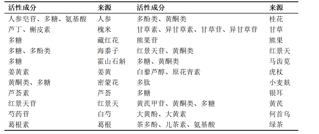 與傳統(tǒng)化妝品相比較,中藥來(lái)源的抗衰老成分是從植物中提取出來(lái)的天然物質(zhì),分子更細(xì)小,更容易被皮膚吸收和消化,而且不致在體內(nèi)產(chǎn)生沉積,目前市場(chǎng)上已有多種來(lái)源于中藥活性成分被用于化妝品的生產(chǎn)(見(jiàn)下表)[9-10]。